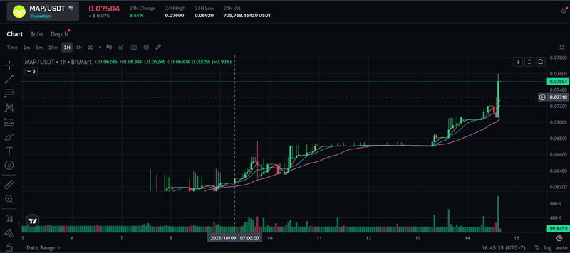 In just the past 24 hours, MAP/USDT has grown steadily around the 0.076 – 0.078 USDT range, showing that buying power is still overwhelming. Trading volume remains high, demonstrating the appeal of MAP in the context of the general market showing signs of slowing down.